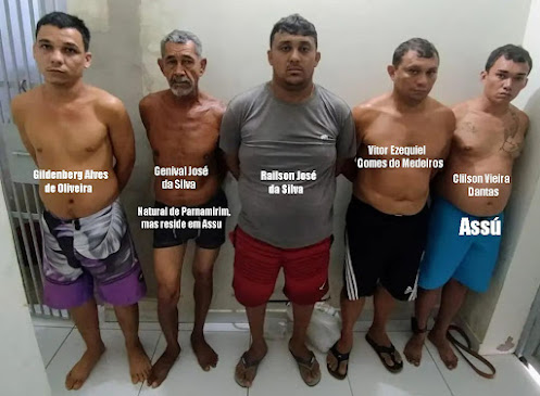 Todos foram identificados e são eles: o assuense, Clilson Vieira Dantas, 30 anos, vulgo “Cleissin”, presos outras vezes em Assú, uma por homicídio, assaltos e roubos, sendo preso em 2018 na operação crepúsculo que foi realizada em Assú. “Cleissin” esta usando uma tornozeleira eletrônica.