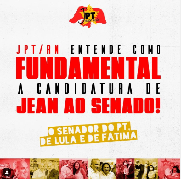 PS: Desta maneira, a JPT/RN contribui para a tática eleitoral do PT/RN sinalizando que precisamos construir a candidatura de reeleição do senador Jean Paul, ao lado de Fátima Bezerra governadora, Lula presidente, e nossos/as deputados/as federais e estaduais.