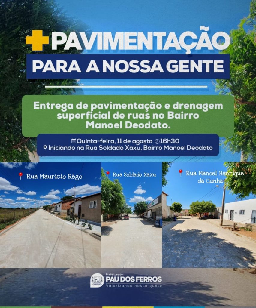 Ainda no bairro Manoel Deodato, a Rua Manoel Henrique da Cunha também será contemplada em 271,88 m² de pavimentação, no valor de R$ $ 12.457,07. Outra rua beneficiada com pavimentação e drenagem superficial foi a Maurício Rêgo, também no mesmo bairro, com investimento de R$ 77.524,27, sendo R$ 45.333,09 do convênio e R$ 32.191,18 de contrapartida, com área pavimentada de 880m², após anos de espera, serão pavimentadas e drenadas pela Gestão Valorizando Nossa Gente.
