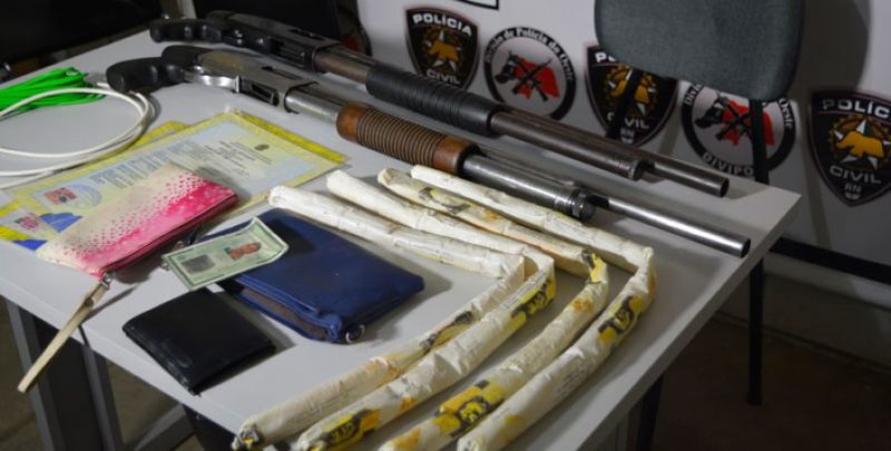 Em uma das casas, os policiais encontraram quatro bananas de dinamites, cordão detonantes e uma escopeta calibre 12 de repetição com capacidade para oito munições. Dois carros, sendo um Celta e um Gol também foram apreendidos durante a ação da Divipoe.