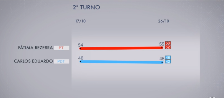 Nos votos totais, Fátima Bezerra, do PT, tem 52%, e Carlos Eduardo, do PDT, 42%. É a última pesquisa antes das eleições de domingo.
