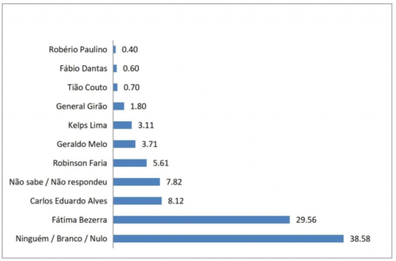 O governador Robinson Faria marcou 5,6%, ficando em terceiro lugar. Atrás dele vem Geraldo Melho (3,7%), Kelps Lima (3,1%), General Girão (1,8%), Tião Couto (0,7%), Fábio Dantas (0,6%) e Robério Paulino (0,4%).
