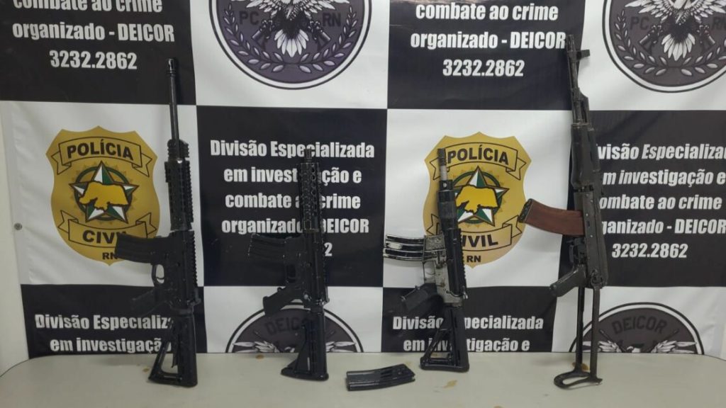 Policiais civis da Divisão Especializada em Investigação e Combate ao Crime Organizado (DEICOR) deflagraram, no último sábado (23), a 4ª fase da Operação “Sinaloa” e apreenderam quatro fuzis e vários carregadores. O material foi encontrado no distrito Sítio Sítio, localizado entre os municípios de João Dias e Antônio Martins, e a propriedade pertence à família Jácome de João Dias. Em caixas enterradas no local, foram encontrados três fuzis 556 e um AK-47.