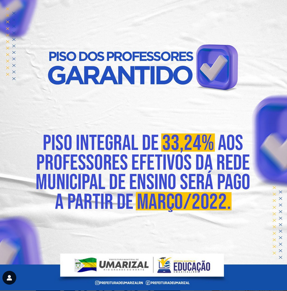 O Prefeito de Umarizal-RN, Raimundo Pezão, antecipa o pagamento dos servidores no mês de fevereiro/2022, e anuncia que realizará o pagamento do piso integral de 33,24% aos professores efetivos da rede municipal de ensino, em março do corrente ano.