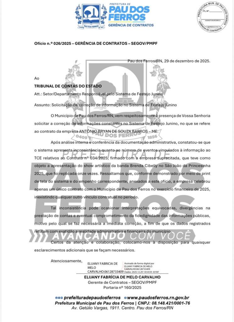 A Prefeitura de Pau dos Ferros esclareceu, nesta segunda-feira (29), que houve apenas uma única contratação da banda ANTÔNIO BRYAN DE SOUZA BARROS – ME no ano de 2025, no valor de R$ 8.000,00, e que a informação divulgada na mídia local, como se fossem 11 contratações, foi causada por erro no sistema oficial do painel vinculado ao Tribunal de Contas do Estado (TCE).