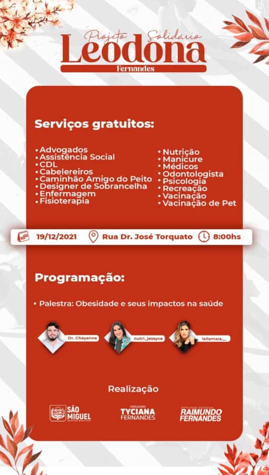 Vem aí, no próximo Domingo, o Projeto Solidário Leodona Fernandes, com serviços solidários e gratuito à população micaelense. Este projeto tem o objetivo de promover ações gratuitas para comunidade de São Miguel, com atendimentos de cunho social e cultural. Teremos participação da Banda de Música Hesíquio Fernandes, Mazzaropi e grupo de dança.