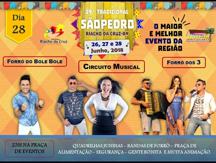 Nesta quinta-feira (28), as bandas Circuito Musical, Forró dos 3 e Forró do Bole Bole, irão encerrar mais uma edição do tradicional e maior São Pedro da região Oeste do RN, em Riacho da Cruz.