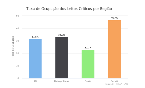 Segundo a Sesap, a Região metropolitana apresenta 33% dos leitos críticos ocupados, a região Oeste tem 22,7% e a Região Seridó tem 46,7%.