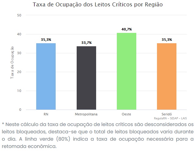 Segundo a Sesap, a Região metropolitana apresenta 33,7% dos leitos críticos ocupados, a região Oeste tem 40,7% e a Região Seridó tem 35,3%.