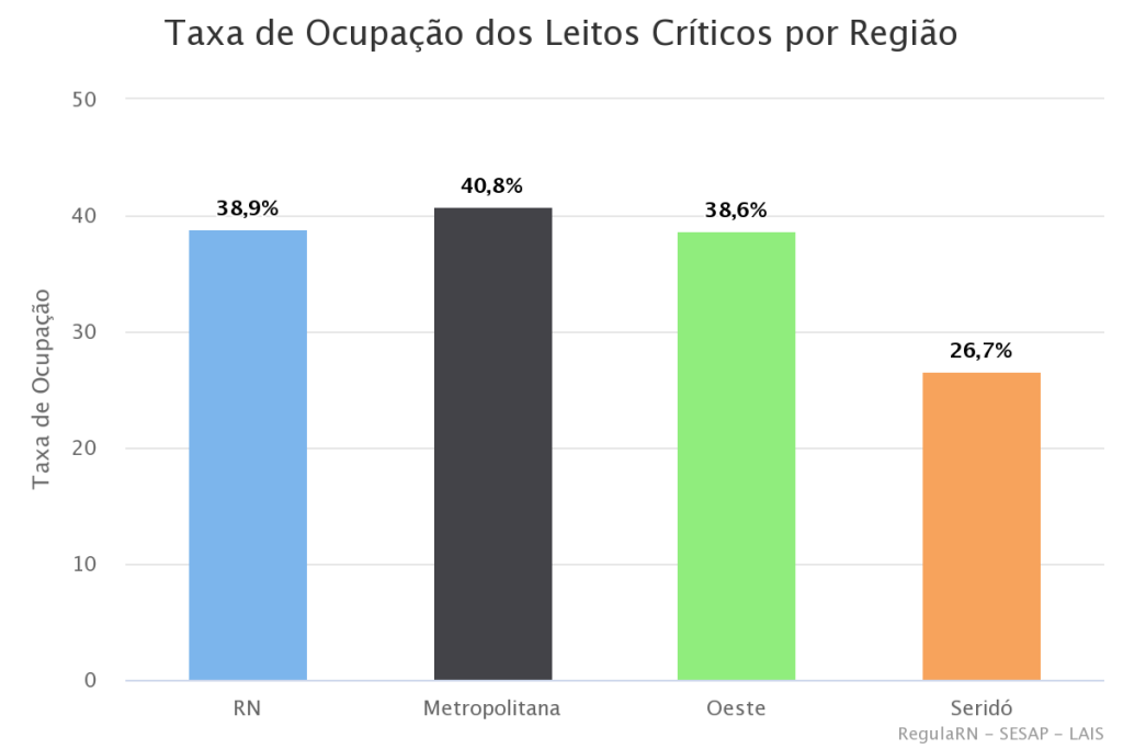 Segundo a Sesap, a Região metropolitana apresenta 40,8% dos leitos críticos ocupados, a região Oeste tem 38,6% e a Região Seridó tem 26,7%.