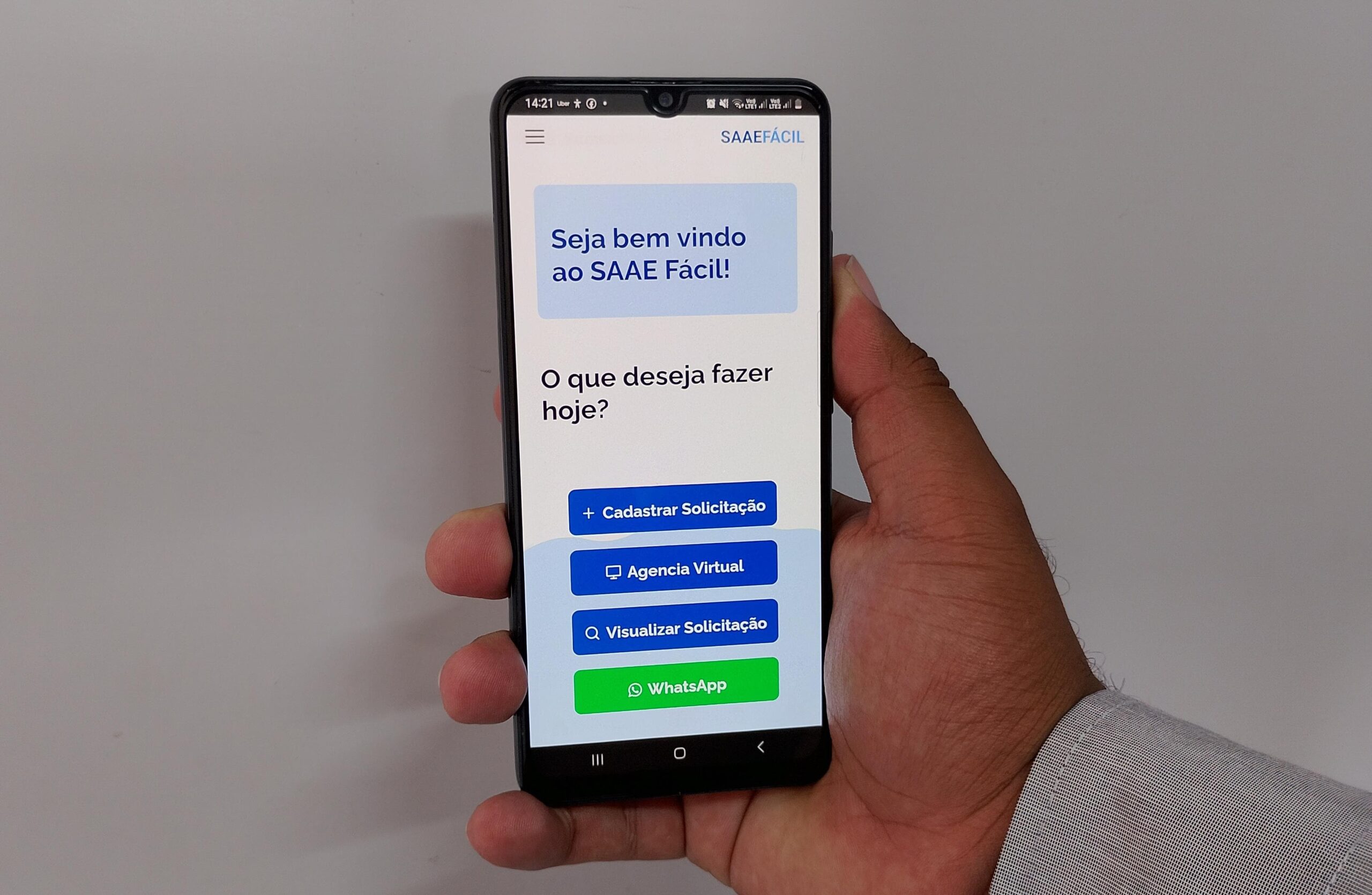 A segunda é o aplicativo “SAAE Fácil”, disponível para Android e iOS. A ferramenta reúne atendimento via WhatsApp, acesso à Agência Virtual e solicitações como nova ligação, comunicação de vazamentos e acompanhamento de protocolos.