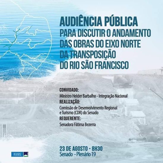Na próxima quarta-feira, 23, a Comissão de Desenvolvimento Regional e Turismo do Senado discutirá o andamento das obras do Eixo Norte da transposição do Rio São Francisco. O debate ocorre a pedido da senadora.